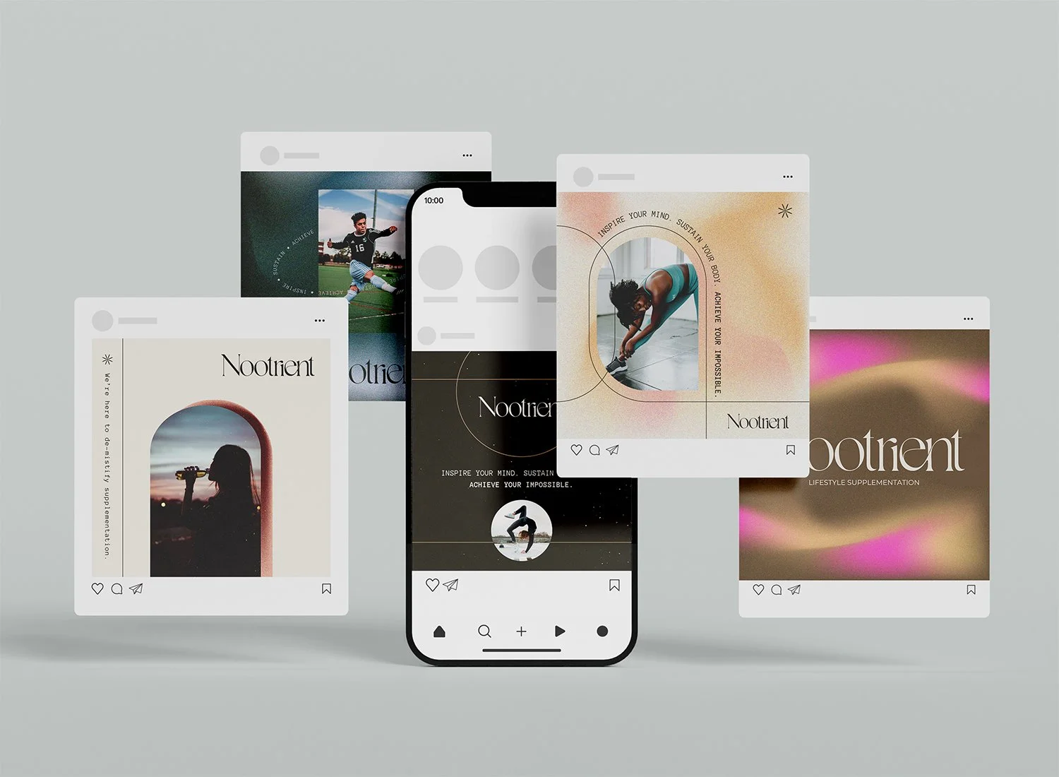 Nootrient, a fresh force in the world of performance nutrition, needed a complete visual identity to match its powerhouse lineup of hydration and protein powders. The goal: craft a brand as dynamic and impactful as the products themselves. I designed a bold logo and versatile brand mark, anchored by a thoughtfully curated color palette and distinctive typography. Central to the identity is a system of five flowing shapes, capturing the brand’s energy. To elevate the storytelling, I created signature visual elements—Gold Sparks representing bursts of energy, and Clarity Bursts for moments of focus—bringing personality and movement to the brand. This cohesive, electrifying identity extends across every touchpoint, from packaging to social media templates, ensuring Nootrient doesn’t simply appear in the market—it boldly makes a statement.